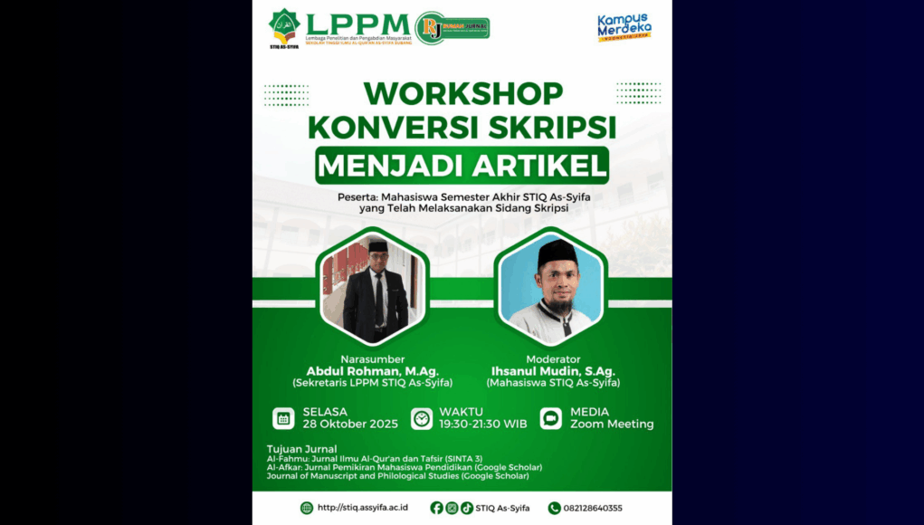Dengan terselenggaranya workshop ini, LPPM berharap para mahasiswa tidak sekadar menyelesaikan kewajiban akademik, tetapi juga mampu membawa gagasan penelitiannya ke ruang publik ilmiah. Artikel-artikel hasil konversi ini diharapkan menjadi langkah awal mahasiswa memasuki dunia publikasi dan memperkaya khazanah keilmuan STIQ As-Syifa.